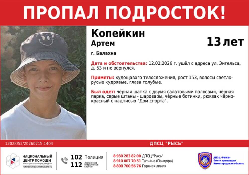 Пропавший в Балахне 13-летний подросток найден живым. Об этом сообщает Поисково-спасательный центр «Рысь» в соцсетях. Мальчик пропал 12 февраля, он ушёл из адреса ул. Энгельса, 53 Ранее на сайте pravda-nn.ru сообщалось, что пропавшая на Бору 15-летняя девочка найдена живой.... Далее