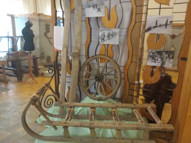 Из того, что было под рукой, артельщики делали и другие важные предметы обихода. Не хватало многого. Машин было мало, и нужны были сани и колёса для телег – гужевого транспорта, на котором привозили продукты и оружие и увозили в тыл раненых. А некоторые артели делали костыли, которых требовалось огромное количество. И все эти вроде бы простые товары становились значимым вкладом в Победу.Одна из витрин рассказывает о том, как женщины заменили ушедших на фронт мужчин. Токарному ремеслу учились девочки, но вместо тончайших деревянных чаш они точили черенки для сапёрных лопат на самом простом ножном токарном станке. Ведь в деревнях не было электричества. Такой станок тоже есть на выставке. И он до сих пор в рабочем состоянии!