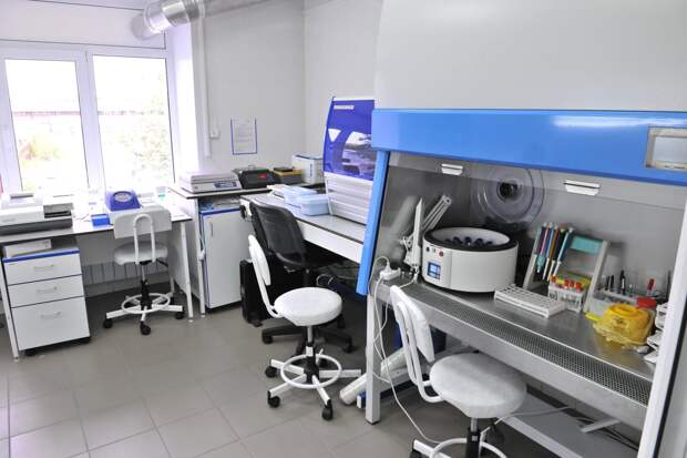 Для нее выделили изолированный от остальных помещений медцентра этаж, вход в лабораторию возможен толькосо специальным магнитным ключом.В помещении смонтирована автономная приточно-вытяжная вентиляция с многоступенчатой фильтрацией воздуха, установлены ламинарные шкафы для очистки воздуха, рециркуляторы, аппараты для диагностики.