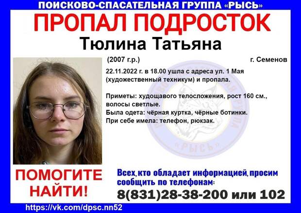 15-летняя и 16-летняя девушки вечером 22 ноября ушли из художественного техникума на улице 1 Мая в Семенове и пропали. Волонтеры ПСО «Рысь» просят помочь с их поиском. Подростки вышли из техникума около 6 вечера. После их не видели, на связь с близкими они не выходили.