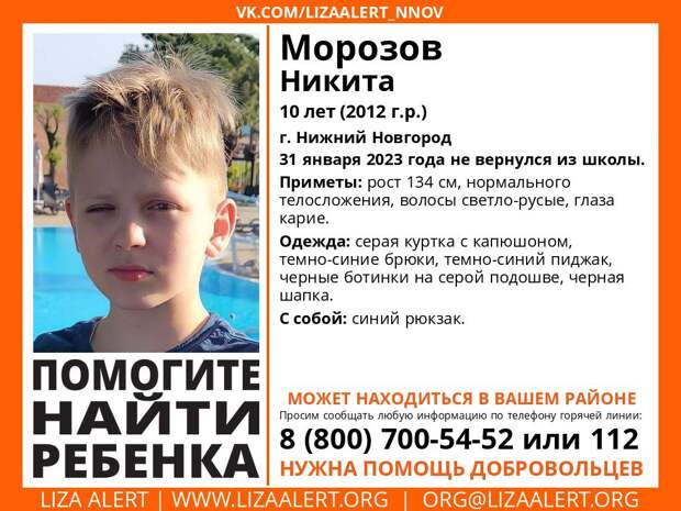 10-летний ребенок пропал после школьных уроков в Нижнем Новгороде. Волонтеры ПСО «ЛизаАлерт» просят помочь с поисками. Никита Морозов не вернулся из школы 31 января. Добровольцы уже отправились искать ребенка: сбор группы состоялся в 19:00 около детской поликлиники №32 на проспекте Ленина.