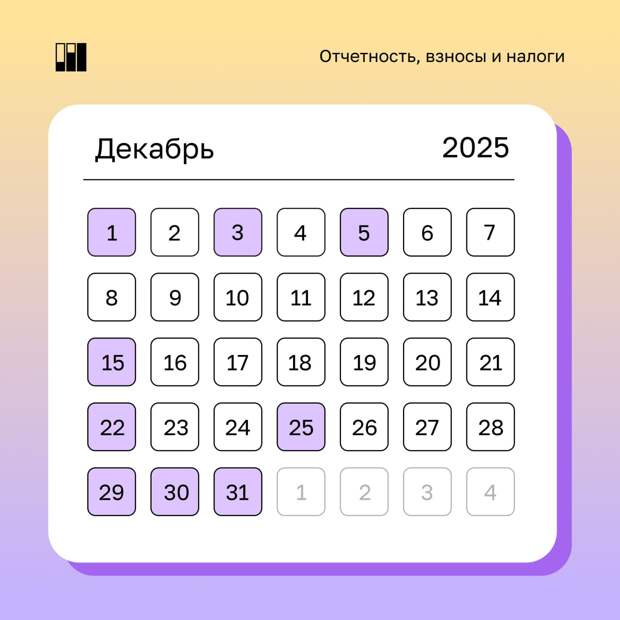 Так, для ИП важно не пропустить 29 декабря, когда они должны уплатить имущественные налоги за 2024 год и страховые взносы за себя за 2025‑й (перенос даты с 31 декабря). Тем, кто хочет изменить свой налоговый режим, до конца декабря стоит определиться с новым, не дожидаясь крайнего срока. До 1 декабря: — ИП, имеющие недвижимость и транспорт, уплачивают имущественные налоги за 2024 год: земельный и транспортный, налог на имущество физических лиц. До 3 декабря: — Организации и ИП с работниками направляют уведомление по НДФЛ за период с 23 по 31 ноября (если в это время были выплаты работникам) и до 5 декабря уплачивают его. До 15 декабря: — Организации и ИП с работниками уплачивают страховые взносы в СФР «по травматизму» за ноябрь. До 22 декабря: — Импортеры товаров из стран ЕАЭС уплачивают косвенные налоги и сдают декларацию за ноябрь. До 25 декабря: — Организации и ИП с работниками направляют: 1. уведомление по страховым взносам «в налоговую» за ноябрь и НДФЛ за период с 1 по 22 декабря; 2. персонифицированные сведения о физлицах за ноябрь; — Производители подакцизных товаров сдают декларацию по акцизам; — Организации и ИП на АвтоУСН, уплачивают налог за ноябрь; — Организации на ОСН, которые перешли на уплату налога по фактической прибыли, сдают декларацию за ноябрь. До 29 декабря: — ИП уплачивают фиксированные страховые взносы за себя за 2025 год (53 658 рублей); — Организации и ИП с работниками уплачивают страховые взносы за работников «в налоговую» за ноябрь и НДФЛ за период с 1 по 22 декабря; — Организации и ИП на ОСН, УСН и ЕСХН уплачивают треть НДС за третий квартал (если не освобождены от НДС в связи с небольшим доходом по п. 1 ст. 145 НК); — Организации на ОСН уплачивают аванс по налогу на прибыль (если не перешли на поквартальную уплату по п. 3 ст. 286 НК); — Производители подакцизных товаров уплачивают акцизы; — Самозанятые уплачивают налог за ноябрь. До 30 декабря: — Организации и ИП с работниками, которым производились выплаты за период с 23 по 30 января 2025 года, направляют уведомление по НДФЛ за этот период и уплачивают его. До 31 декабря (в связи с выходными последним днем срока становится 12 января): — ИП на ПСН оплачивают патент, если он со сроком до 31.12.2025; — Можно подать уведомление о переходе на иной режим (на УСН, АвтоУСН, ЕСХН или на ОСН) либо на иной способ расчета налога на УСН / налога на прибыль организаций (изменить объект налогообложения или способ уплаты авансовых платежей). Напомним, обо всех мерах поддержки бизнеса на федеральном и региональном уровнях нижегородские предприниматели могут узнать в центре «Мой бизнес» (мойбизнес52.рф), который осуществляет деятельность в рамках федерального проекта «Малое и среднее предпринимательство» национального проекта «Эффективная и конкурентная экономика». На базе центра работает горячая линия «Мой бизнес», где также можно получить всю необходимую информацию. Телефон горячей линии: 8 (800) 301 – 29-94 (звонок бесплатный). Нацпроект «Эффективная и конкурентная экономика», инициированный президентом России Владимиром Путиным, стал главным инструментом формирования новой модели роста. В его состав вошли федеральные проекты, направленные на развитие малого и среднего предпринимательства, повышение производительности труда, рост инвестиционной активности, низкоуглеродное развитие и развитие государственной си