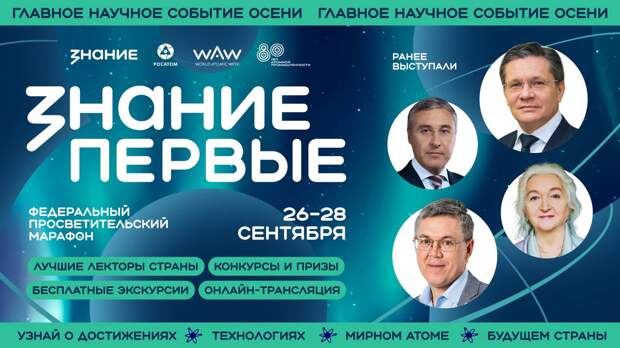 Организатором марафона выступает Общество «Знание» при поддержке ГК «Росатом». Марафон Знание.Первые охватит все федеральные округа страны, станет одним из ключевых мероприятий, посвященных празднованию 80-летия атомной промышленности в России, и войдет в программу международного форума World Atomic Week. В основе концепции марафона лежит идея энергии будущего, которая движет вперед экономику и промышленность, вдохновляет культуру и искусство, дает повод с оптимизмом смотреть в завтрашний день. В центре внимания участников и лекторов будет 80-летняя история атомной промышленности, её достижения, научные подвиги советских и российских ученых, мирный атом как символ прогресса и атомная энергия как залог суверенитета и независимости России. Важной темой марафона станут возможности для самореализации молодых людей в атомной отрасли на благо страны и мира. «Нижний Новгород в этом году стал основной площадкой празднования юбилея атомной промышленности России: 20 августа на нашем стадионе прошло масштабное торжество „Эра мечтателей“, которое собрало около 30 тысяч зрителей. Марафон Знание.Первые, к которому присоединилась столица Приволжского федерального округа, — это прекрасная возможность в очередной раз подчеркнуть огромный вклад горьковских, нижегородских ученых, инженеров и производственников в создание мирного атома. Мощности региона десятилетиями обеспечивали выпуск уникального высокотехнологичного оборудования для российских атомных станций нового поколения. Госкорпорация „Росатом“, являясь достойным наследником и продолжателем мощной советской научно-технической школы, обеспечила преемственность традиций и вывела отрасль на лидирующий мировой уровень. Уверен, что современные молодые специалисты — смелые, грамотные, влюбленные в свое дело и увлеченные получением новых знаний — укрепят статус нашей страны как флагмана развития энергетики будущего», — сказал губернатор Нижегородской области Глеб Никитин. Программу марафона в Нижнем Новгороде составят лекции и открытые диалоги известных людей с молодежью. К участию приглашены политолог, ведущий Первого канала, профессор МГИМО Дмитрий Саймс, магистр игры «Что? Где? Когда?», президент Федерации спортивного бриджа России Максим Поташев, олимпийская чемпионка по фигурному катанию Алина Загитова и другие. Наряду с основной программой марафона — лекциями, открытыми диалогами, дискуссиями — участников центральной площадки в Москве ждут дополнительные просветительские форматы. Школьники и студенты побывают на экскурсиях в павильоне № 19 АТОМ на ВДНХ. В павильоне № 57 «Россия — моя история» будет возможность отправить в любой уголок страны тематические открытки, подготовленные совместно с «Почтой России». В завершающий день марафона, 28 сентября, состоится масштабный флешмоб Движения Первых на площади Промышленности на ВДНХ в Москве: участники марафона выстроятся в форме атома. А 29 сентября флешмоб подхватят школьники всей страны после уроков «Разговоры о важном». Просветительские мероприятия, посвященные 80-летию атомной промышленности, стартуют ещё до начала марафона. Одно из них –– тематическая игра, которая состоится 23 сентября и войдет в отборочный этап турнира «Знание.Игра: школы и колледжи». С 15 по 30 сентября Общество «Знание» запустит серию т