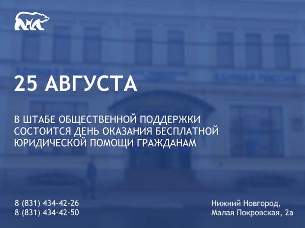 25 августа на площадке Штаба общественной поддержки партии «Единая Россия» состоится День оказания бесплатной юридической помощи гражданам. Мероприятие пройдет при поддержке региональной общественной приемной партии и Нижегородского регионального отделения «Ассоциации юристов России».
