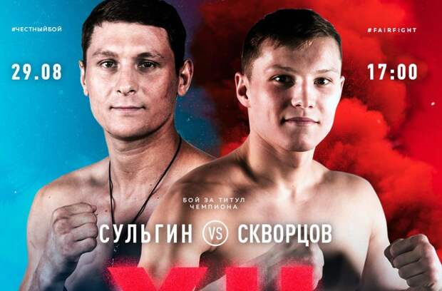 29 августа в Екатеринбурге состоится 12-й профессиональный турнир по правилам Fair Fight. Главным на нём станет бой за титул чемпиона в лёгком весе между нижегородцем Александром Скворцовым и Максимом Сульгиным из Новосибирска.
