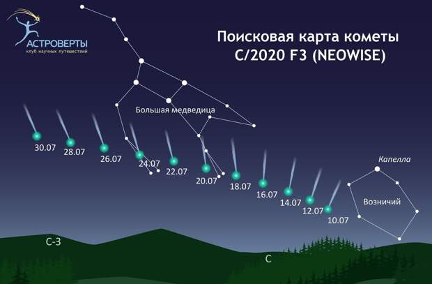 км). А вот уже 1 февраля она пролетит всего в 42 млн км от Земли и при этом увидеть её смогут как в России, так и во всех странах северного полушария. Она будет пролетать прямо между Ковшом Большой Медведицы и Полярной звездой.Она не только очень яркая — длина её газового хвоста будет размером с «черпак» Ковша. При таких параметрах комета доступна для наблюдений даже невооружённым глазом.