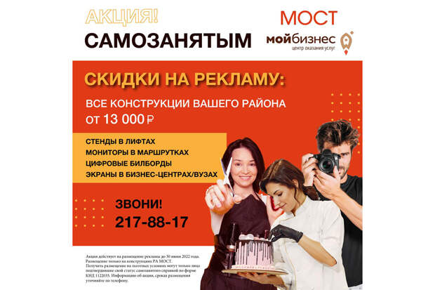 Мы разработали специальный пакет, позволяющий разместить рекламу в пределах одного района города на всех конструкциях агентства «МОСТ» по сниженным ценам». До 30 июня 2022 года самозанятые могут получить в агентстве «МОСТ» размещение на стендах в лифтах, мониторах в транспорте, бизнес-центрах, ВУЗах, диджитал билбордах за 13 000 – 18 500 рублей. Данные цены на размещение доступны только тем, кто подтвердил свой статус самозанятого справкой КНД 1122035. Предложенная мера поддержки является беспрецедентной для Нижнего Новгорода и позволяет самозанятому сформировать охватную программу размещения в пределах выбранного района Нижнего Новгорода (охват более 3 млн. человек).Данную инициативу поддержал центр оказания услуг «Мой бизнес». Администратор головного офиса Стелла Кузнецова пояснила: «В настоящее время поддержка бизнеса важна как никогда. В центре «Мой бизнес» предприниматель может получить различные виды услуг: консультационные, информационные, финансовые и иные услуги по началу и ведению бизнеса. Поддержка самозанятых реализуется в нашем регионе с самого начала введения статуса «самозанятых» и пользуется популярностью среди населения. Так с 2021 г. на базе центра «Мой бизнес» реализуется проект для самозанятых граждан «Займись делом!
