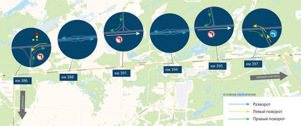 А разворот в сторону Москвы через одноуровневую развязку на 388 км при движении по трассе со стороны Нижнего Новгорода будет разрешен левый поворот на Северное шоссе.На перекрестке, где трасса примыкает автодороге 22К-0028 на 391 км (поворот на Балахну) ликвидируется светофор. Выезд с местной дороги возможен только направо. Развернуться в сторону Нижнего Новгорода можно на петле на 388 км. Разворот в сторону автодороги 22К-0028 при движении из Москвы возможен через аналогичную развязку на 393 км.