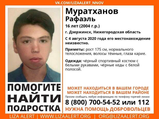 16-летний подросток пропал в Дзержинске. Муратханов Рафаэль ушел из дома 4 августа и больше его не видели.