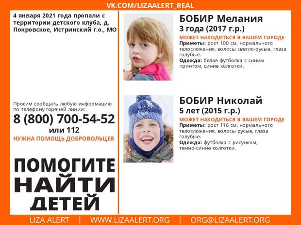 Трехлетняя Мелания и пятилетний Николай пропали вчера с территории детского клуба в деревне Покровской Истринского района. Сейчас дети могут быть в Нижнем Новгороде.