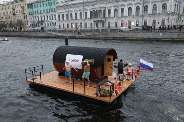 Как пишет «Петербургский дневник», по реке Фонтанке на буксире у катера двигалось плавсредство с черной цистерной, на стенке которой красовалась надпись: «В баню!». Из цистерны, как Диогены из бочки, периодически выбирались на свежий воздух почти обнаженные мужчины и махали руками редким прохожим.После нескольких кругов между Шереметьевским дворцом и Аничковым мостом плавучая баня причалила к набережной у Музея Фаберже. Экипаж нестандартного судна предстал перед журналистами и малочисленными прохожими.