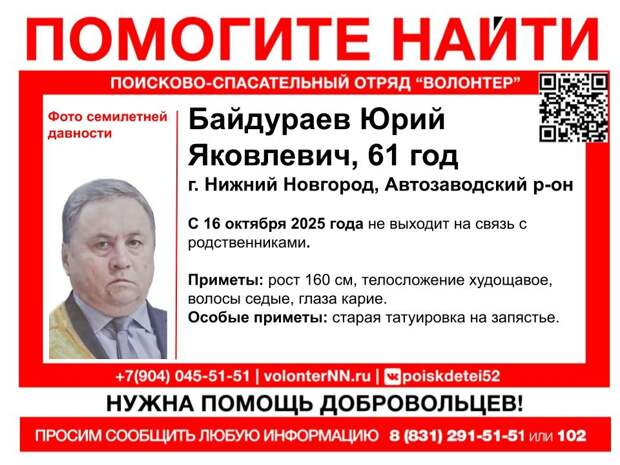 Нижегородцев, у которых есть какая-либо информация о местонахождении мужчины, просят позвонить на горячую линию отряда ПСО «Волонтёр» 8-(831) 291 – 51-51 или инфоргу поиска 8 – 952-463 – 27-39 (Любовь).