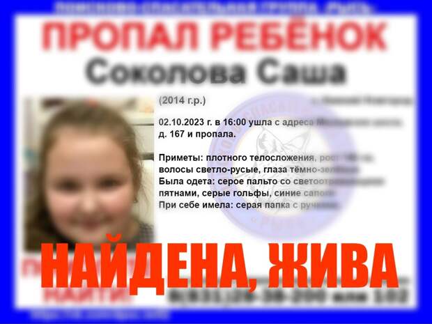 9‑летняя девочка, пропавшая в Нижнем Новгороде, найдена живой. Об этом сообщили волонтеры поисково-спасательного центра «Рысь». «Всем спасибо за оперативное реагирование и распространение информации!», — говорится на странице ПСЦ ВКонтакте.