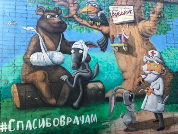 В этот раз героем стрит-арта стал знаменитый добрый доктор из детства Айболит, который лечит мишку, волка и маленького зайчика.