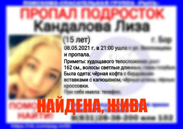 15-летняя Лиза Кандалова найдена в городе Бор Нижегородской области 9 мая. Об этом сообщил поисково-спасательный центр «Рысь».
