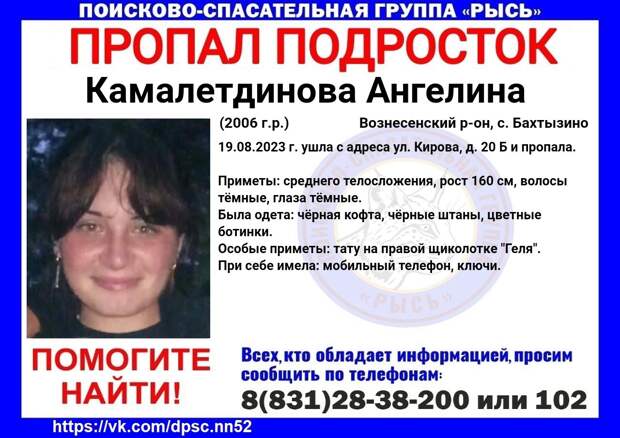 17-летняя Ангелина Камалетдинова пропала в Воскресенском районе. Об этом сообщили в поисково-спасательном центре «Рысь». В субботу, 19 августа, подросток ушла из дома на улице Кирова в селе Бахтызино и пропала.