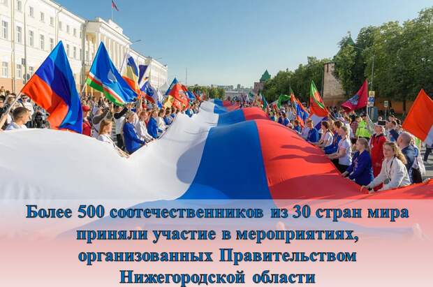 В первом полугодии 2023 года правительство Нижегородской области организовало более 80 мероприятий по поддержке соотечественников, проживающих за рубежом. Они проводились как на территории региона и субъектов Российской Федерации, так и в таких странах, как Азербайджан, Белоруссия, Германия, Казахстан, Китай, Сербия, Сирия, Таджикистан и Узбекистан.