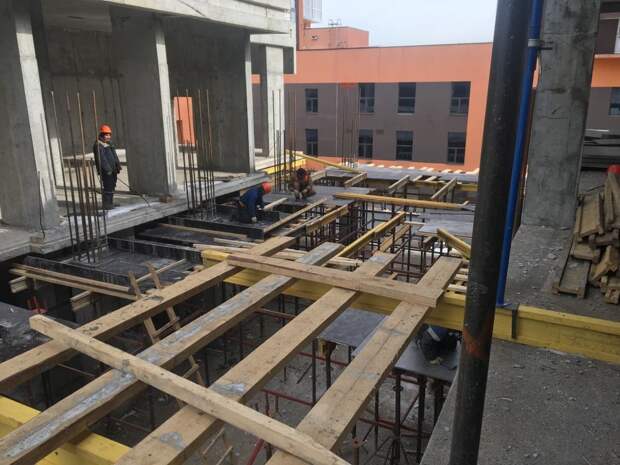 Ведутся монолитные работы по возведению каркаса здания и стилобатной части, заполнение проемов, возведение внутренних стен и перегородок, проводится монтаж систем отопления и вентиляции. Также выполняется монтаж системы пожаротушения в стилобатной части и зоне парковки.«В ближайшее время планируем приступить к электромонтажным работам, начнется установка окон и разводка систем водоснабжения и водоотведения», — сообщил начальник управления по строительству региональной дирекции Денис Ляшенко.