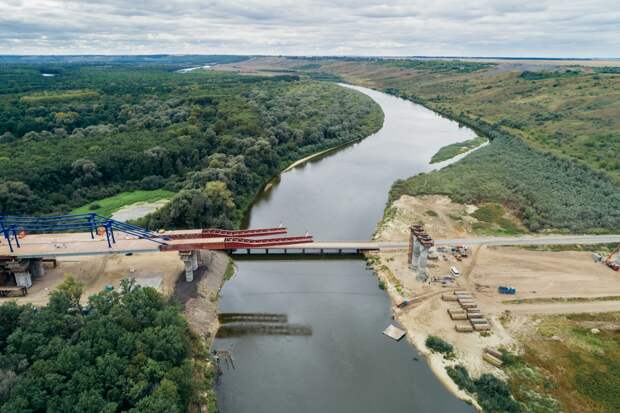 Сейчас там закончились работы по надвижке пролетного строения через русло реки – от седьмой к пятой опоре. С обеих берегов были надвинуты два пролета. Их длина составила 195 метров, а вес – 2881 тонна. Мостовикам ещё предстоит произвести 477 метров надвижки от пятой к первой опоре.