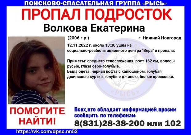 Как сообщает поисково-спасательная группа «Рысь», Екатерина ушла из центра «Вера» днем. После этого ее никто не видел. Приметы девушки: рост 162 сантиметра, волосы русые, глаза серо-голубые.