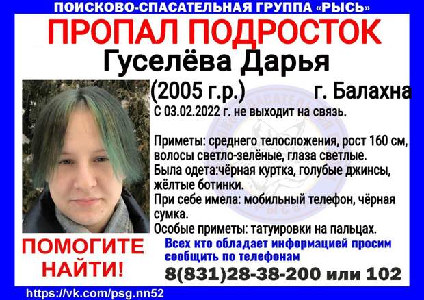 17-летняя Дарья Гуселева пропала в Балахне. Об этом говорится в группе поисково-спасательного отряда «Рысь — Балахна» ВКонтакте.