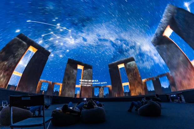 Пока читатели перебирали книги, настало время сеанса, и заветная дверь в зал открылась. Первое ощущение, что вокруг – от горизонта до горизонта – бескрайнее небо! Здесь нет привычных рядов кресел и пронумерованных мест. На полу в причудливом порядке лежат кресла-мешки, и каждый зритель может улечься на них и насладиться программой. Лекция о созвездиях, планетах и звёздах благодаря 3D-проекции произвела ошеломляющее впечатление.