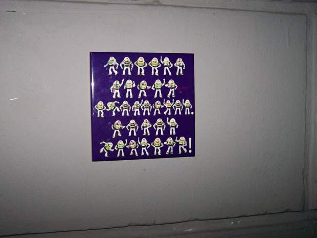 На плитке изображен герой популярного мультфильма «История игрушек» Базз Лайтер в разных позах, каждая из которых соответствует определенной букве алфавита.