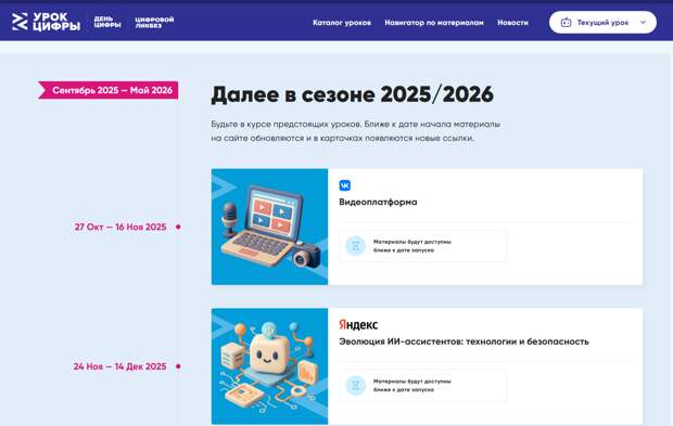 С 27 октября по 16 ноября в российских школах пройдет «Урок цифры» на тему «Видеоплатформа». Школьники узнают, как устроен современный сервис хранения и распространения видео на примере платформы VK Видео. Проект «Урок цифры» ежегодно реализуется АНО «Цифровая экономика» совместно с Минцифры и Минпросвещения России в поддержку федерального проекта «Кадры для цифровой трансформации» национального проекта «Экономика данных и цифровая трансформация государства», реализуемого по поручению президента России Владимира Путина, а также национальной цели «Технологическое лидерство».
