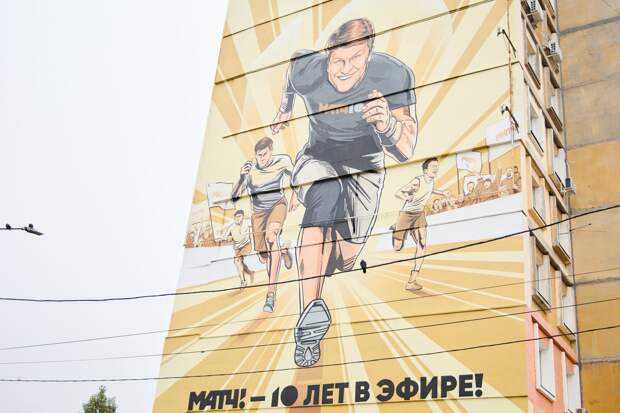 На фасаде девятиэтажного дома на улице Керченской в Нижнем Новгороде открылся огромный мурал к 10-летию «Матч ТВ». Об этом сообщили в пресс-службе телеканала. Новый мурал находится вблизи стадиона «Совкомбанк Арена». Теперь на фасаде жилого дома изображен спортивный комментатор Дмитрий Губерниев во главе забега.