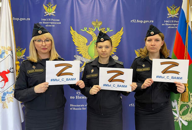 Сотрудники службы приставов держат листовки, на которых над лозунгом #мы_с_вами размещена георгиевская ленточка в виде буквы Z.