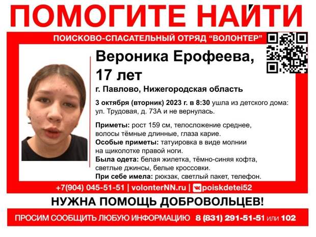 17-летняя девушка с татуировкой на правой щиколотке ушла и детдома в Павлове Нижегородской области и не вернулась, сообщает ПСО «Волонтер НН» ВКонтакте. Вероника Ерофеева ушла из детского дома на улице Трудовой, 73А во вторник, 3 октября в 8:30. Девушка не вернулась до сих пор.