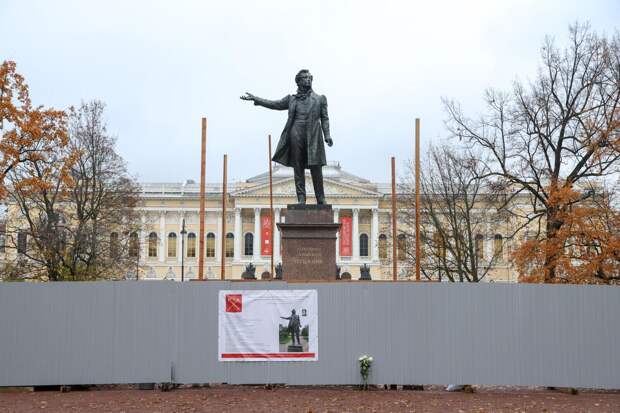 В Санкт-Петербурге стартовали реставрационные работы на памятнике Александру Пушкину, расположенном на площади Искусств. В настоящее время по периметру скульптуры установлен защитный забор, сообщает «Петербургский дневник».