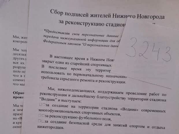 Жители Нижнего Новгорода попросили губернатора Нижегородской области Глеба Никитина и мэра Нижнего Новгорода Юрия Шалабаева напрямую проконтролировать реконструкцию стадиона “Водник”, который ранее закрыли из-за аварийного состояния. Инициативная группа собрала 3243 подписи нижегородцев в поддержку проекта по реконструкции стадиона.