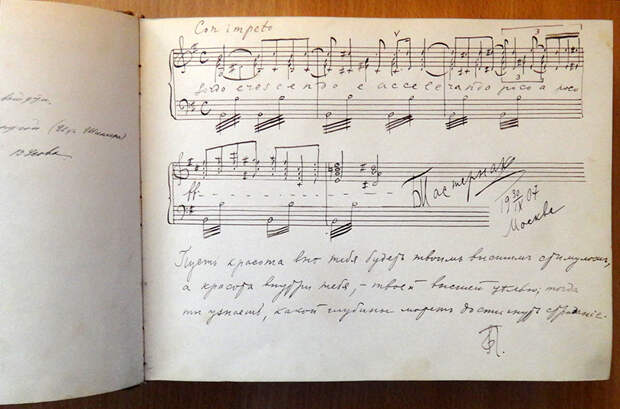 На странице, заполненной Пастернаком, есть его автограф, а также философское напутствие, которое, по словам Большухина, подтверждает мнение исследователей, что юный Пастернак находился под влиянием философии Шопенгауэра.