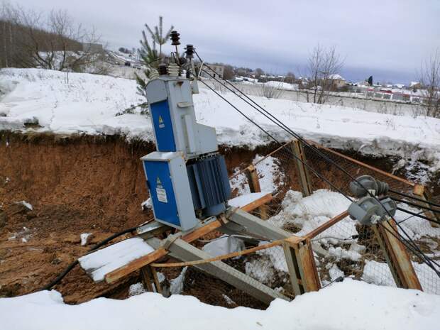 Вода размыла землю, подстанция упала.Без электричества остался только ТЦ, других потребителей у упавшей подстанции нет.
