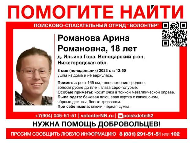 18-летняя девушка пропала в Володарском районе Нижегородской области 2 дня назад, сообщается в группе ПСО «Волонтер НН» ВКонтакте. Арина Романова ушла из дома в деревне Ильина Гора 8 мая в 12:50. Девушка не вернулась до сих пор. На связь с близкими она не выходила.
