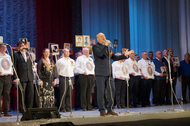 В финале участники на сцене и зрители вместе исполнили песню «День Победы», держа в руках портреты родных – героев Великой Отечественной войны.