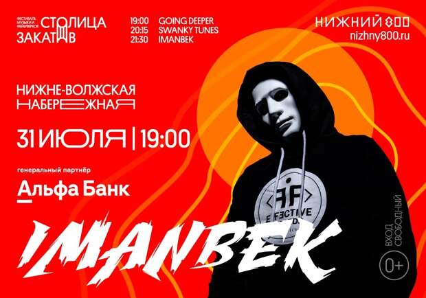 31 июля на Нижне-Волжской набережной пройдет шестой день фестиваля музыки и фейерверков «Столица закатов». Звезду мирового масштаба Иманбека привозит в Нижний Новгород генеральный партнер фестиваля Альфа-Банк. Казахстанский диджей и музыкальный продюсер стал всемирно известным в 2019 году, благодаря своему ремиксу на песню Saint Jhn «Roses», за который получил музыкальную премию «Грэмми»-2021.