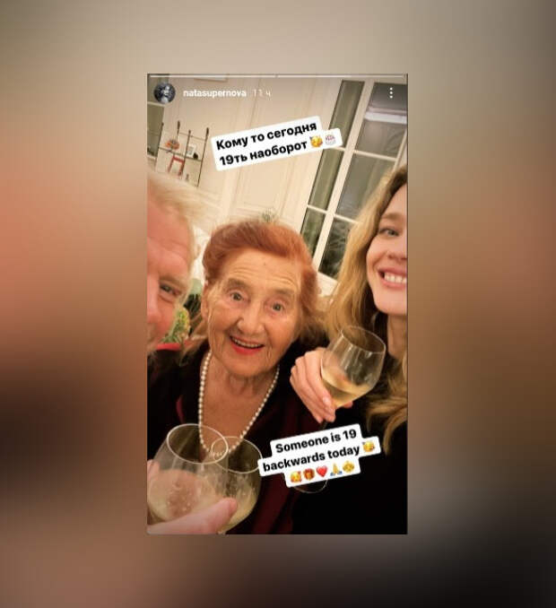 «Кому-то сегодня 19ть наоборот», — написала Наталья Водянова. Судя по снимку, день рождения «бабунички», как она ласково называет свою бабушку, прошел в кругу семьи.