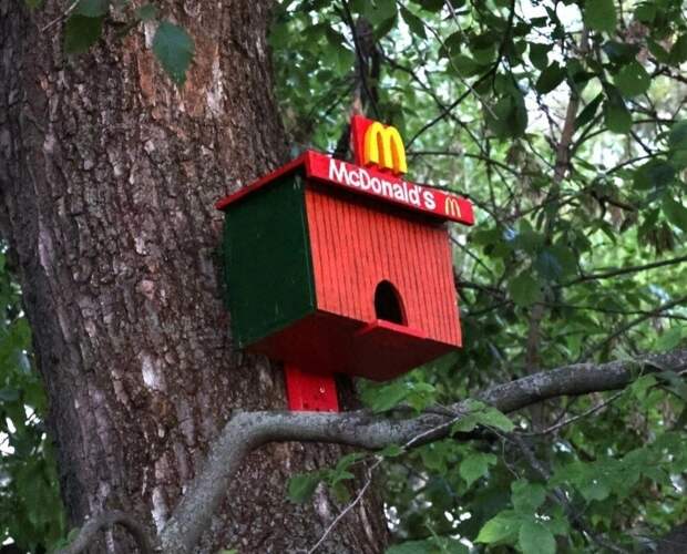 В Александровском саду появился птичий «MC DONALD’S» от художников Ready for evolution и Evst. Об этом авторы сообщили в социальных сетях. Уличные художники установили кормушку для птиц в виде уменьшенной копии «Макдоналдса» на одном из деревьев в Александровском саду.