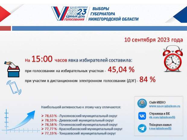По сообщению избирательной комиссий Нижегородской области, по состоянию на 15.00 10 сентября явка при голосовании на избирательных участках составила 45,04%. Наиболее высокая явка избирателей наблюдается в Лукояновском (78,63%), Дивеевском (78,59%), Починковском (78,58%), Краснобаковском (77,77%) и Тоншаевском (77,19%) муниципальных округах.