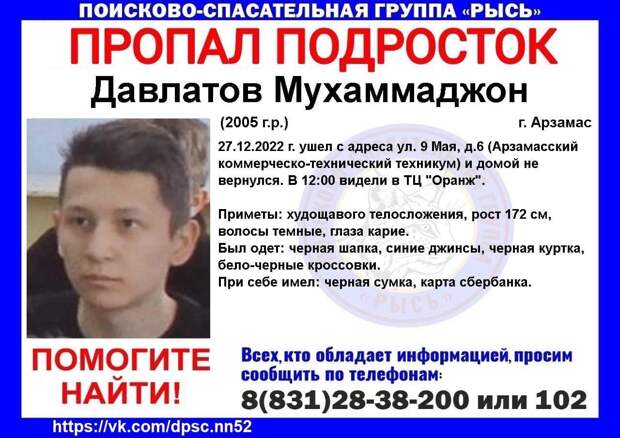 17-летнего Мухаммаджона Давлатова разыскивают в Арзамасе. Об этом сообщает поисково-спасательная группа «Рысь». Подросток ушел во вторник, 27 декабря, из Арзамасского коммерческого-технического техникума на улице 9 мая и с тех пор домой не возвращался. Сообщается, что его видели последний раз в ТЦ «Оранж» в 12.