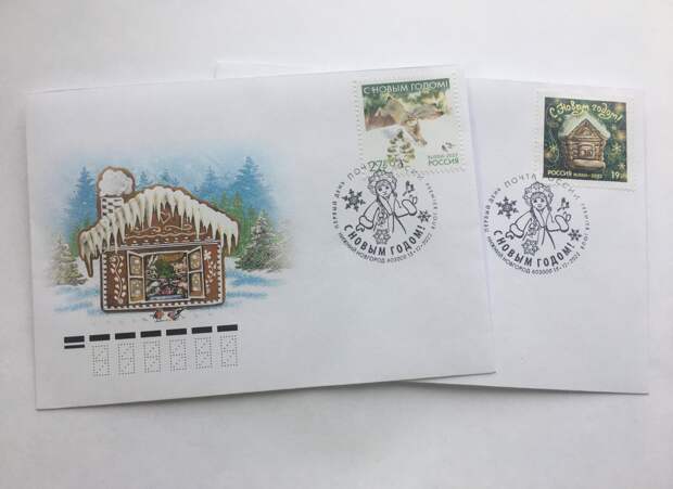 Вторая марка на 19 рублей украшена рисунком зимней избушки на фоне еловых веток.Вместе с марком 15 декабря почта выпустит конверты первого дня и спецгашение с датой 15.12.2022, картинкой Снегурочки и надписью «С Новым годом!».