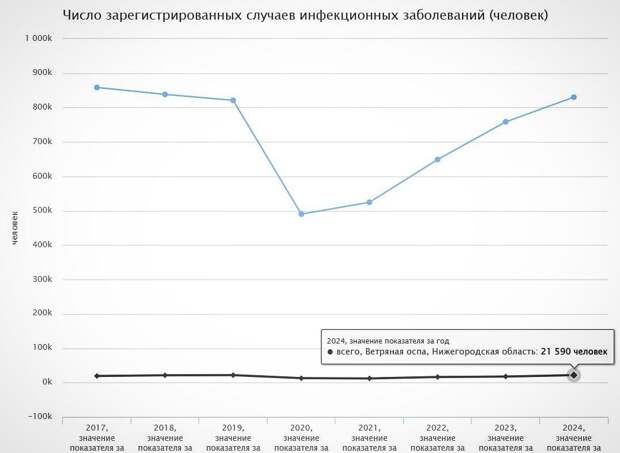 К 2024 году в Нижегородской области значение стало на 8% выше и составило 21 590 больных.Аналогичная ситуация была зафиксирована еще в 2018 и 2019 годах, но тогда о дефиците вакцины не было и речи. Судя по расширенной статистике с 2017 года, самая низкая заболеваемость ветряной оспой наблюдалась в 2020 году.