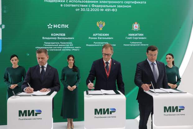 Губернатор Нижегородской области Глеб Никитин, руководитель Казначейства России Роман Артюхин и генеральный директор платежной системы «Мир» Владимир Комлев подписали соглашение о взаимодействии в рамках предоставления жителям региона мер социальной поддержки с использованием электронного сертификата.