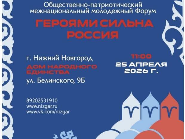 25 апреля в Нижнем Новгороде на площадке Дома народного единства пройдет общественно-патриотический межнациональный молодежный форум «Героями сильна Россия». Мероприятие проводится в рамках Года единства народов России, утвержденного Указом Президента Владимира Путина, и направлено на укрепление гражданской идентичности, межнационального согласия и патриотического воспитания молодежи.