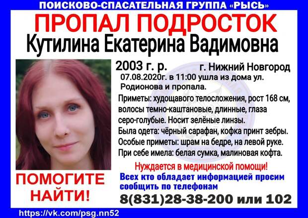 17-летняя Екатерина Кутилина ушла из дома и пропала 7 августа в Нижнем Новгороде.