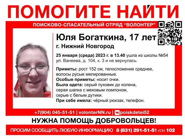 17-летнюю Юлю Богаткину, которая пропала по дороге домой из школы, разыскивают в Нижнем Новгороде. Об этом сообщает поисково-спасательный отряд «Волонтер НН». В среду, 25 января, в 13.40 подросток ушла из школы №54 на улице Ванеева и так и не вернулась домой.