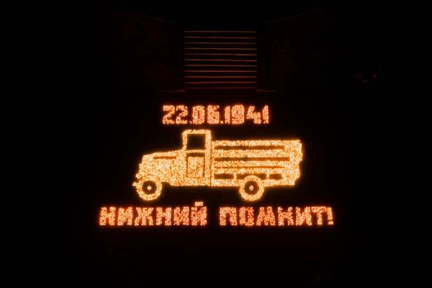 Активисты и волонтеры «Единой России» и «Молодой Гвардии» при помощи Российского союза молодежи Нижегородской области из свечей составили картину, изображающую грузовик ГАЗ-АА. «Полуторки» сыграли огромную роль во время войны. Эти грузовики отличались большой проходимостью, выносливостью и неприхотливостью. Они были незаменимы на фронте, особенно во время блокады Ленинграда. По «дороге жизни» в основном на «полуторках» перевозили продовольствие, и обеспечивалась эвакуация. Благодаря горьковским грузовикам в войну были спасены сотни тысяч жизней, а в послевоенный период они помогали поднимать страну из руин.У монумента Славы прошел памятный митинг, во время которого участники акции почтили память героев Великой Отечественной войны.