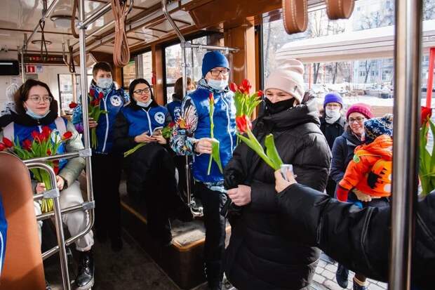 В Нижнем Новгороде 8 марта Волонтеры Победы отправились в праздничный маршрут на трамвае №2 по городскому кольцу, чтобы поздравить прекрасных дам с Международным женским днем.